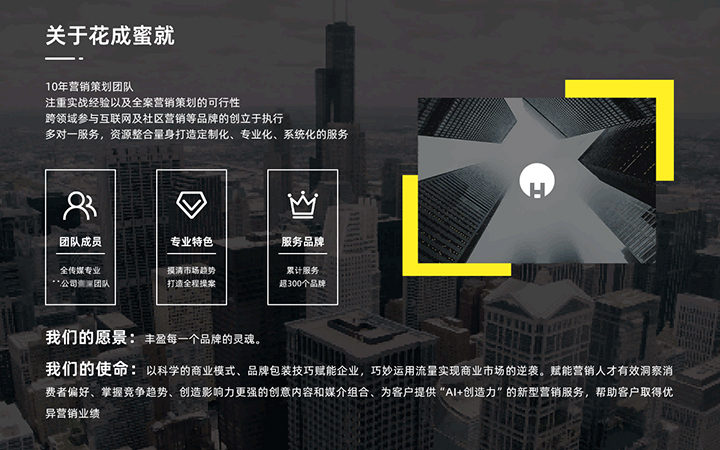 我们的使命:以科学的商业模式、品牌包装技巧赋能企业,巧妙运用流量实现商业市场的逆袭。赋能营销人才有效洞察消费者偏好、掌握竞争趋势、创造影响力更强的创意内容和媒介组合、为客户提供“Al+创造力”的
